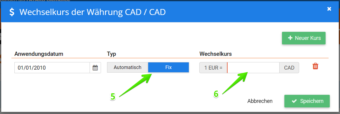 Sie können den Wechselkurs auch manuell direkt in der Ausgabe ändern: