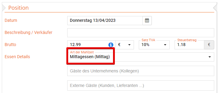 Anhand der auf dem Beleg erfassten Uhrzeit wird den Verpflegungsausgaben automatisch die Art der Mahlzeit gemäß der obigen Zeiteinteilung zugewiesen.