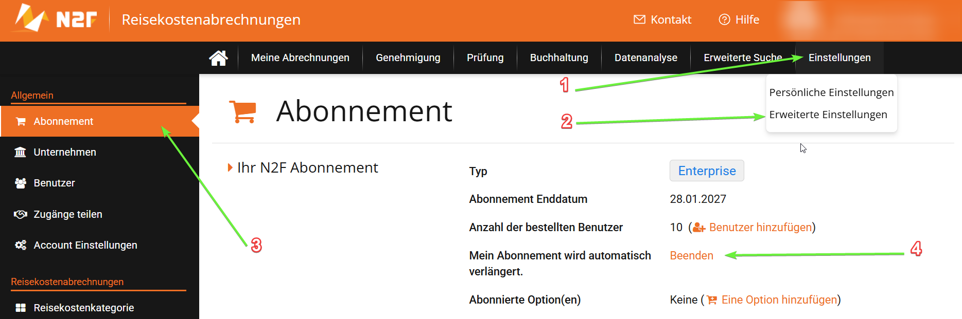 3. Verlängern Sie Ihr Abonnement mit der gewünschten Anzahl an Lizenzen zum Zeitpunkt der Verlängerung: Gehen Sie im Web Browser auf das Menü "Abonnement" und klicken Sie auf "Mein Abonnement verlängern“.