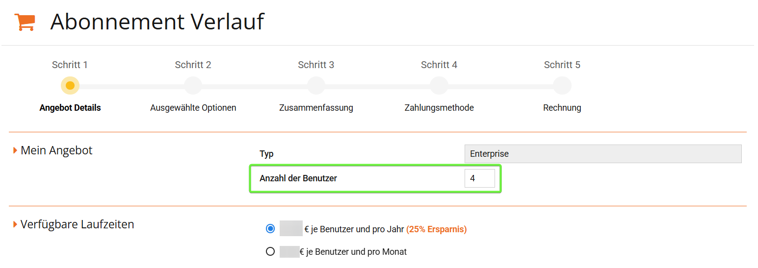 Sollten Sie während Ihrer Abonnementlaufzeit Benutzer hinzufügen, so werden diese anteilig für die verbleibende Laufzeit Ihres Abonnements berechnet.