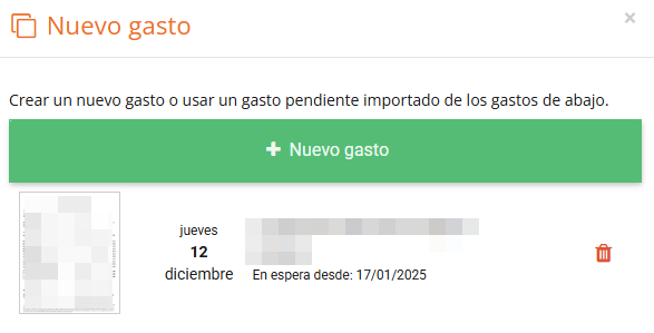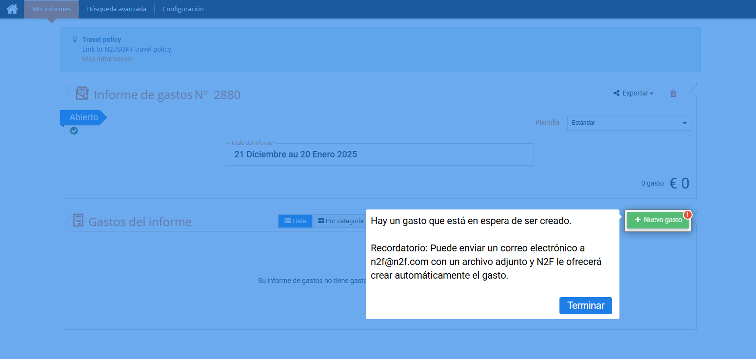 Paso 2: Un gasto pendiente se creará automáticamente en tu cuenta de N2F. Puedes finalizarlo haciendo clic en el botón para agregar gasto desde la aplicación Web o la aplicación móvil:
