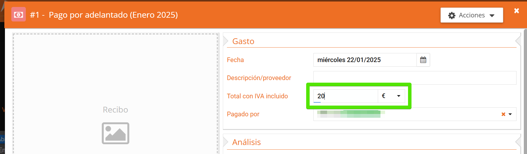 - El IVA no se gestiona en un gasto negativo. El importe del gasto deberá estar en total con IVA incluido.