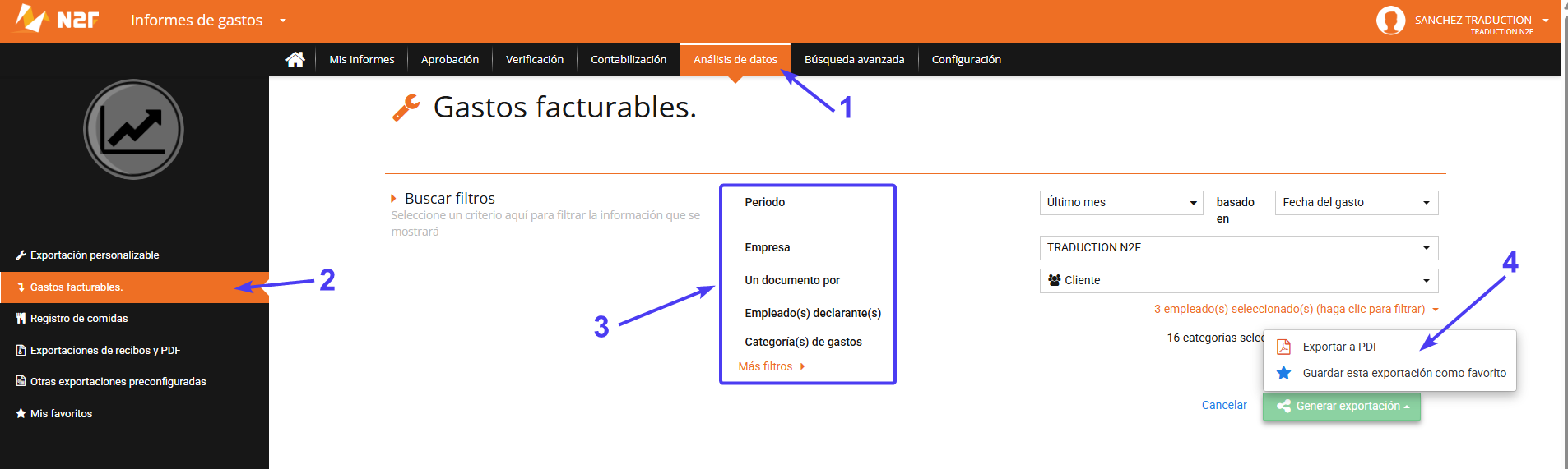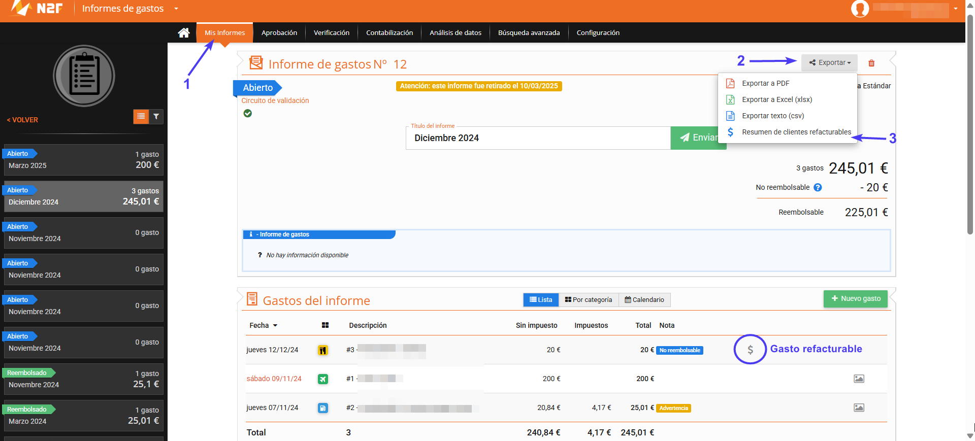 Es posible extraer desde N2F un resumen de los gastos refacturables, que luego podrá transmitir a sus clientes para acompañar una factura.