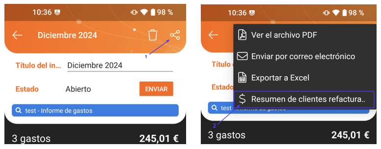 En cada uno de los informes de gastos (el suyo o el de uno de sus usuarios), exporte el resumen refacturable desde la aplicación web: