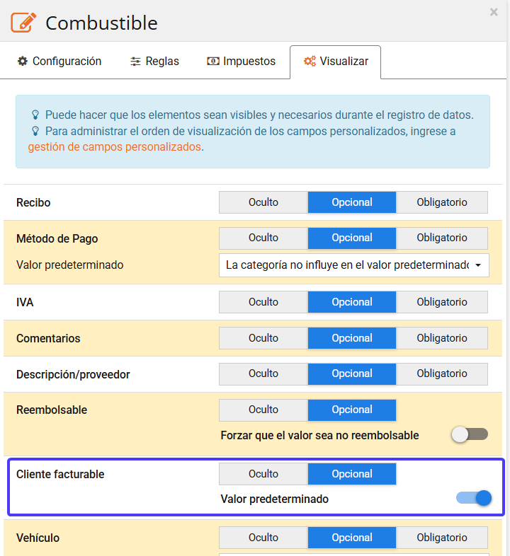 - Si ciertos gastos vinculados a una categoría de gasto específica son siempre refacturables, puede forzar esta condición desde la visualización de la categoría de gasto : Configuración – Configuración avanzada – Categoría de gasto – Visualizar.