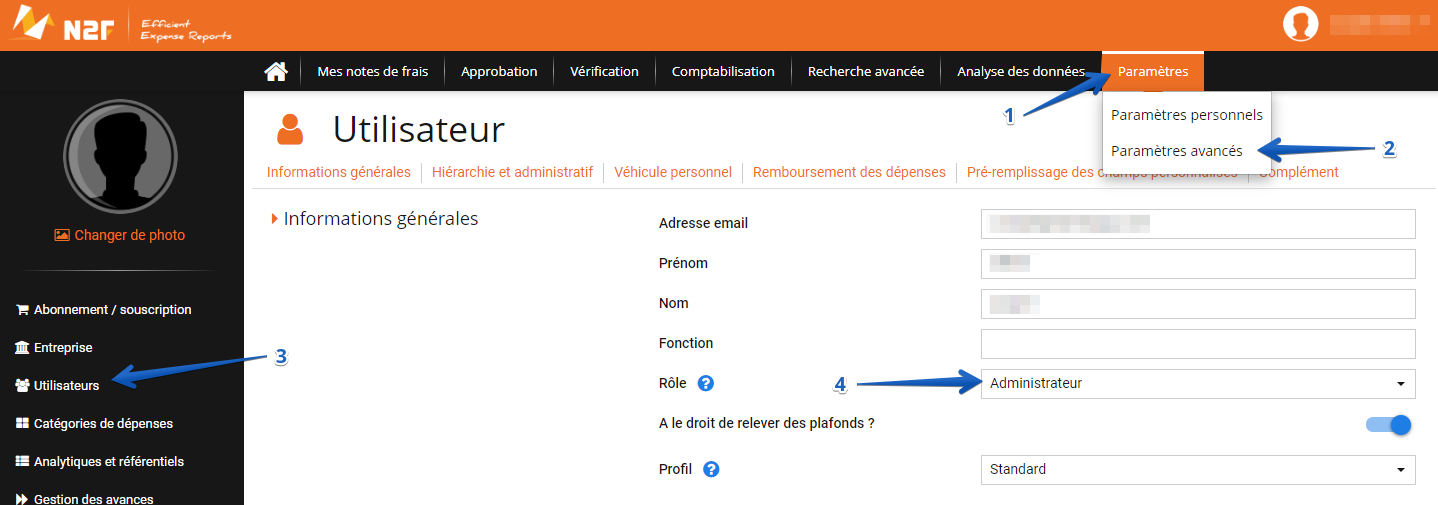 Attention : Si vous souhaitez modifier le rôle d'un collaborateur, vous devrez vérifier qu'il n'ait pas d'action à faire sur une note de frais non comptabilisée, pour ne pas bloquer le processus de traitement de la note.