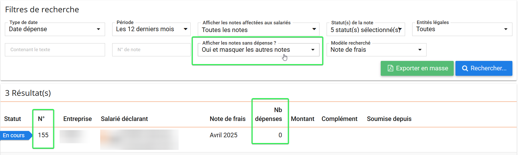 vous pourrez choisir d'afficher le filtre "Afficher les notes sans dépenses" pour les voir apparaître et identifier l’origine du blocage afin de mener les actions nécessaires pour procéder à vos modifications.