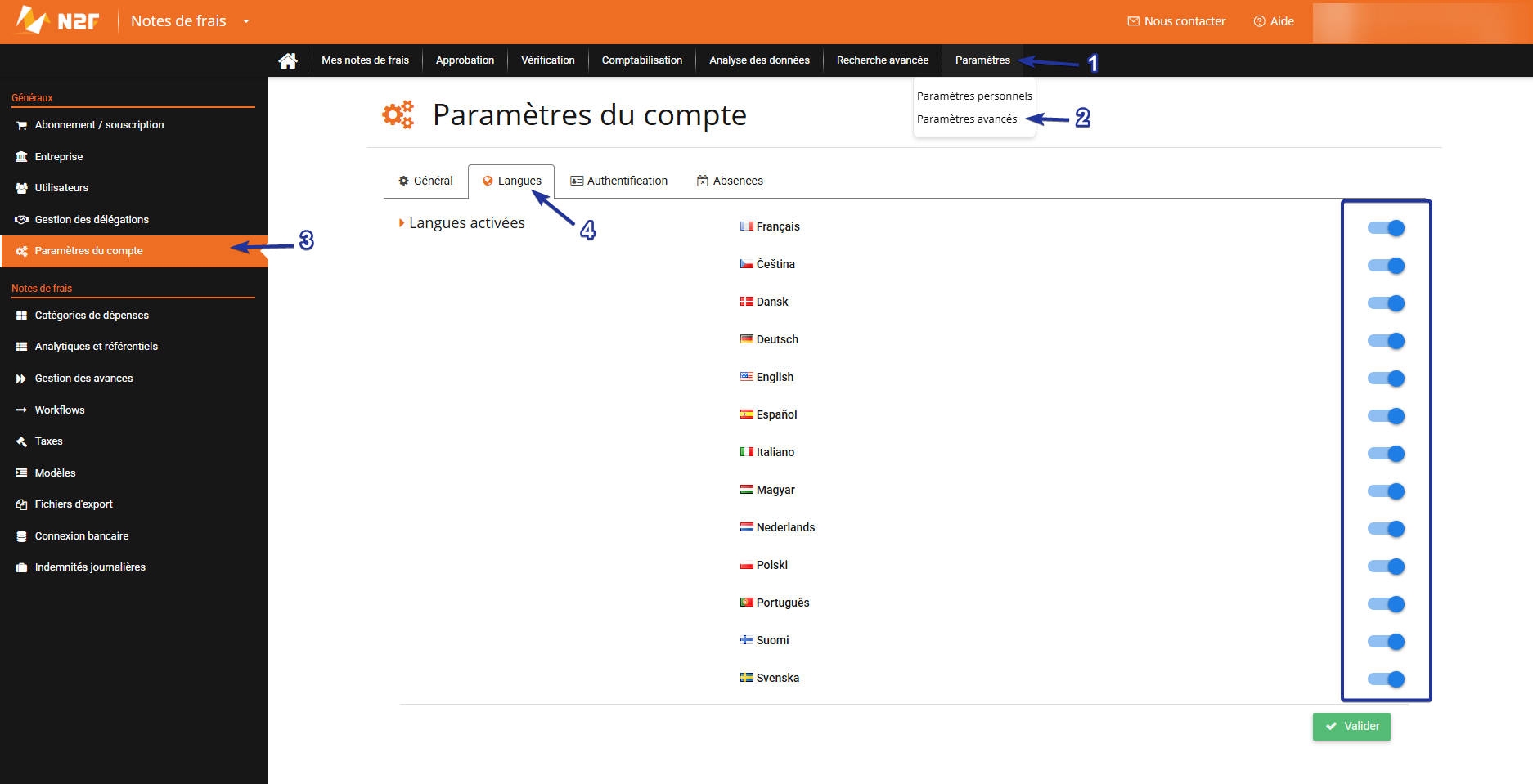 1/ La langue doit être activée par l'administrateur dans le compte de l'entreprise depuis l'application Web :