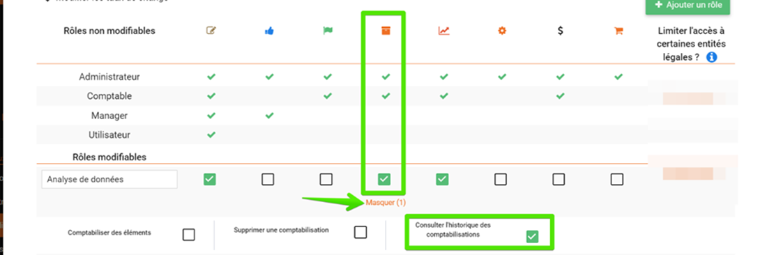 Nous vous invitons à sélectionner le droit "Accès à la comptabilisation" puis à cocher uniquement "Consulter l'historique de comptabilisation" ainsi que le droit "Accès à l'analyse de données" :