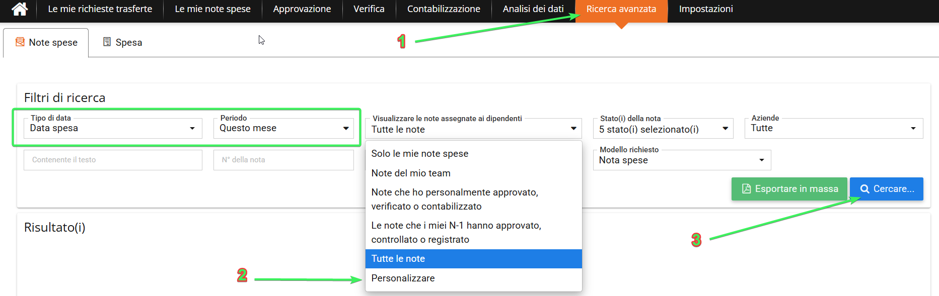 E possibile trovare facilmente la nota spese di un dipendente utilizzando la Ricerca avanzata.