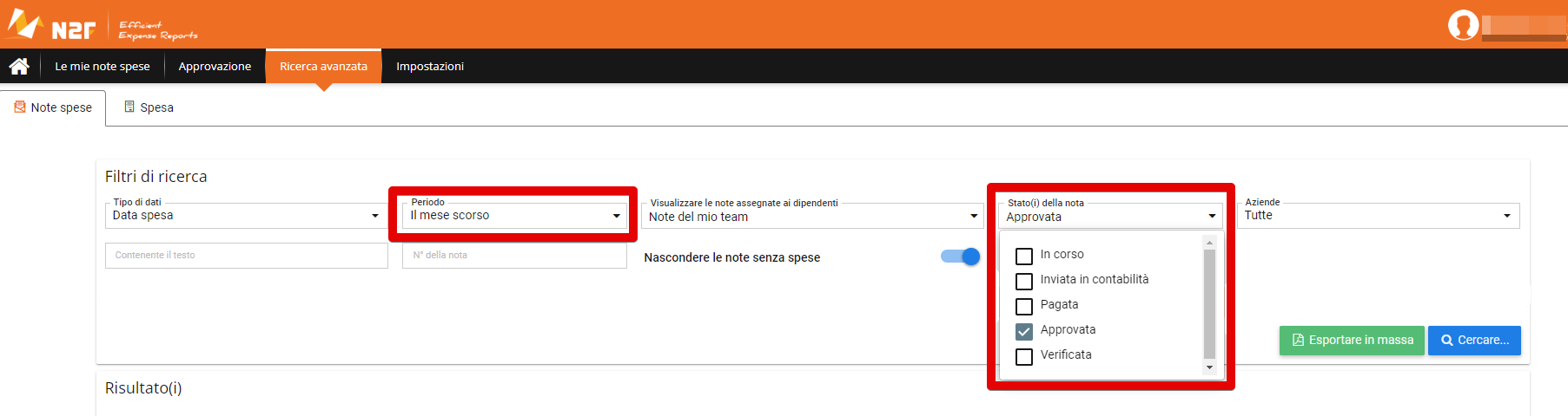Per farlo, occorre andare nel tab Ricerca avanzata e aggiungere i filtri necessari alla propria ricerca. Sull'esempio: se lo scopo è di trovare una nota spese creata il mese scorso di cui lo status è "approvata", bisogna selezionare questi due filtri: